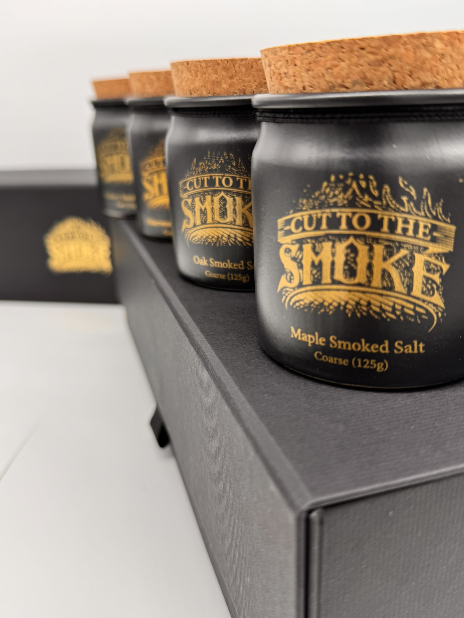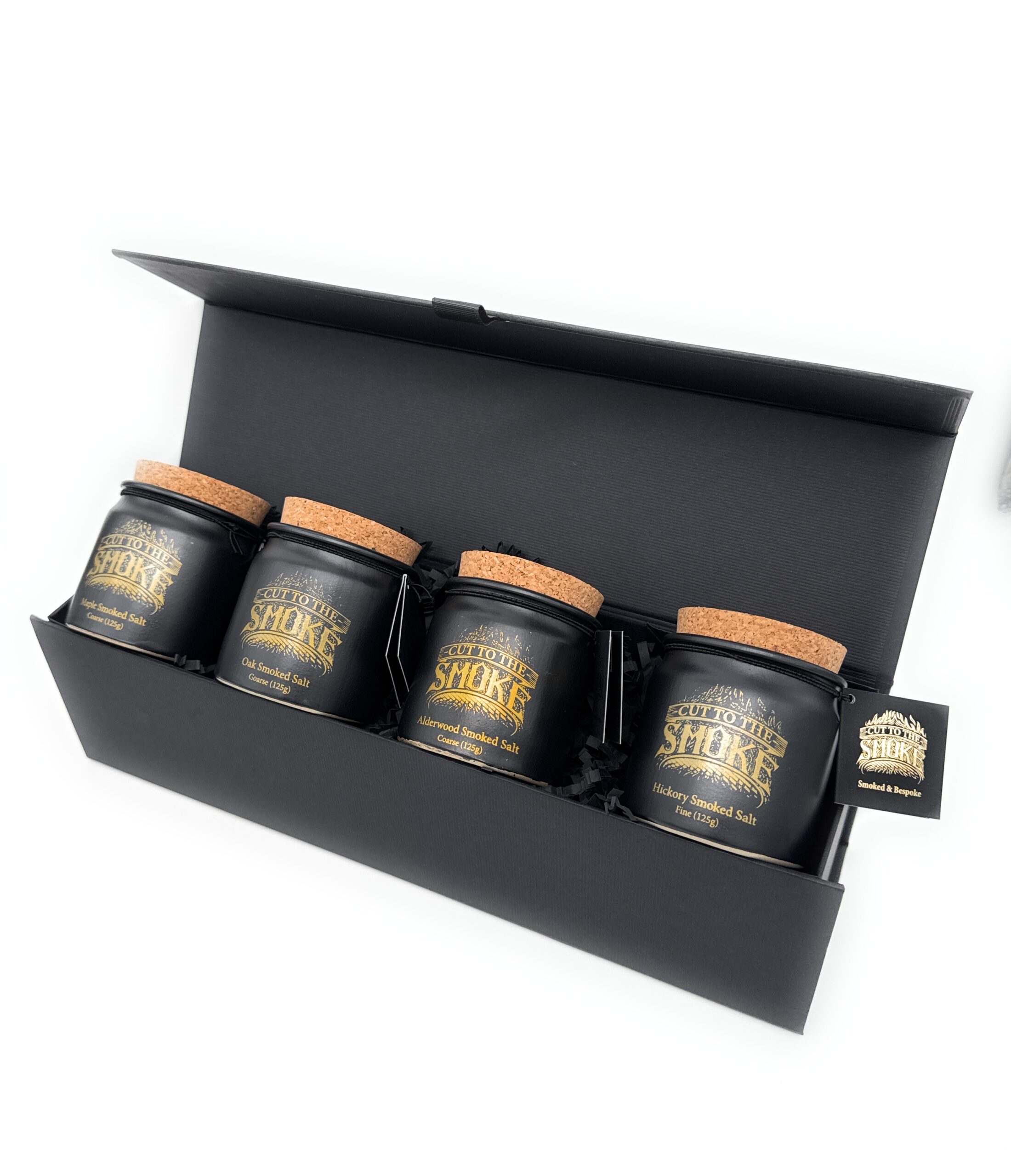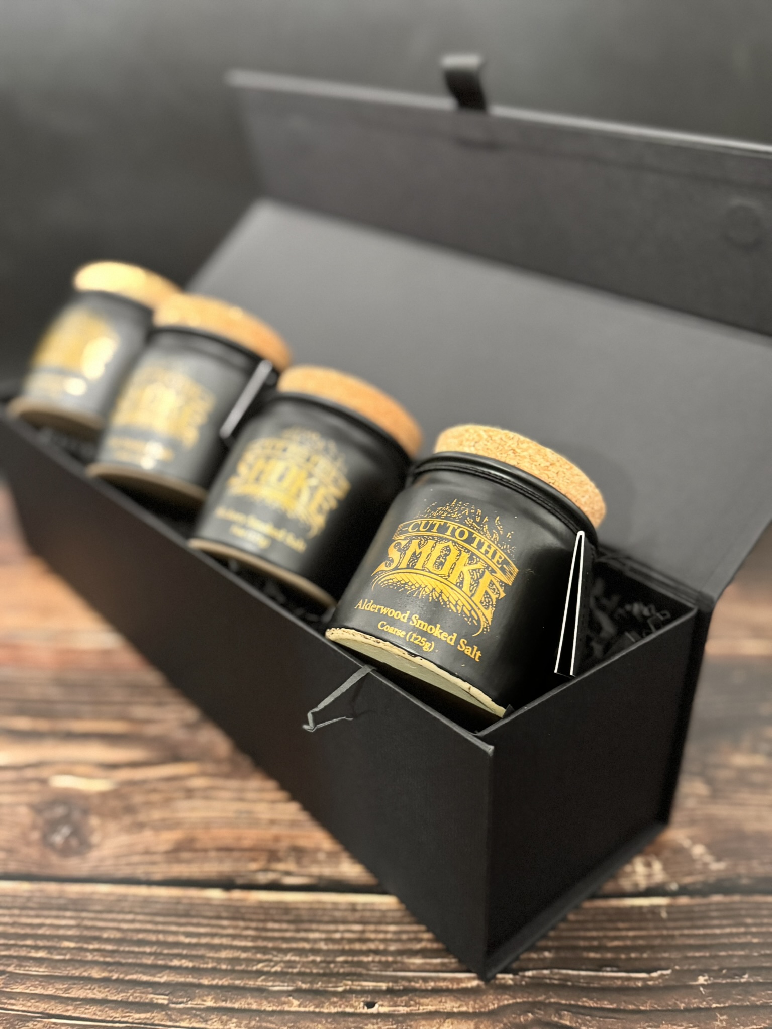 Our luxury black gift box with elegant gold foil print is the perfect way to present 4 of our smoked salts in our stoneware jars. Ideal for any occasion, it transforms our premium seasonings into a thoughtful and sophisticated gift.